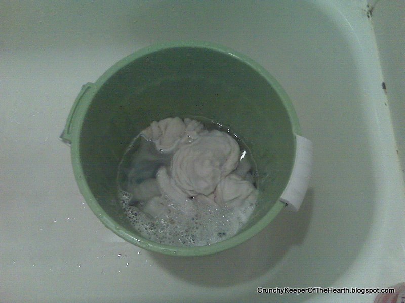 I already use flats (a single layer of cloth folded to fit around baby) almost full time. So what is going on my baby won't really change from the norm this week. What will change is my wash routine. I will be handwashing diapers daily instead of machine washing every other day or so. I could wash less frequently, but smaller batches are easier.Hand washing diapers take less time than machine washing, although usually the machine is the one taking the time instead of me. We have an HE washer and it isn't all that great for this task, so washing diapers is usually an all day process. If I hand wash, I will get the diapers cleaner than the machine as I pay more attention to details and washing doesn't take hours on end.